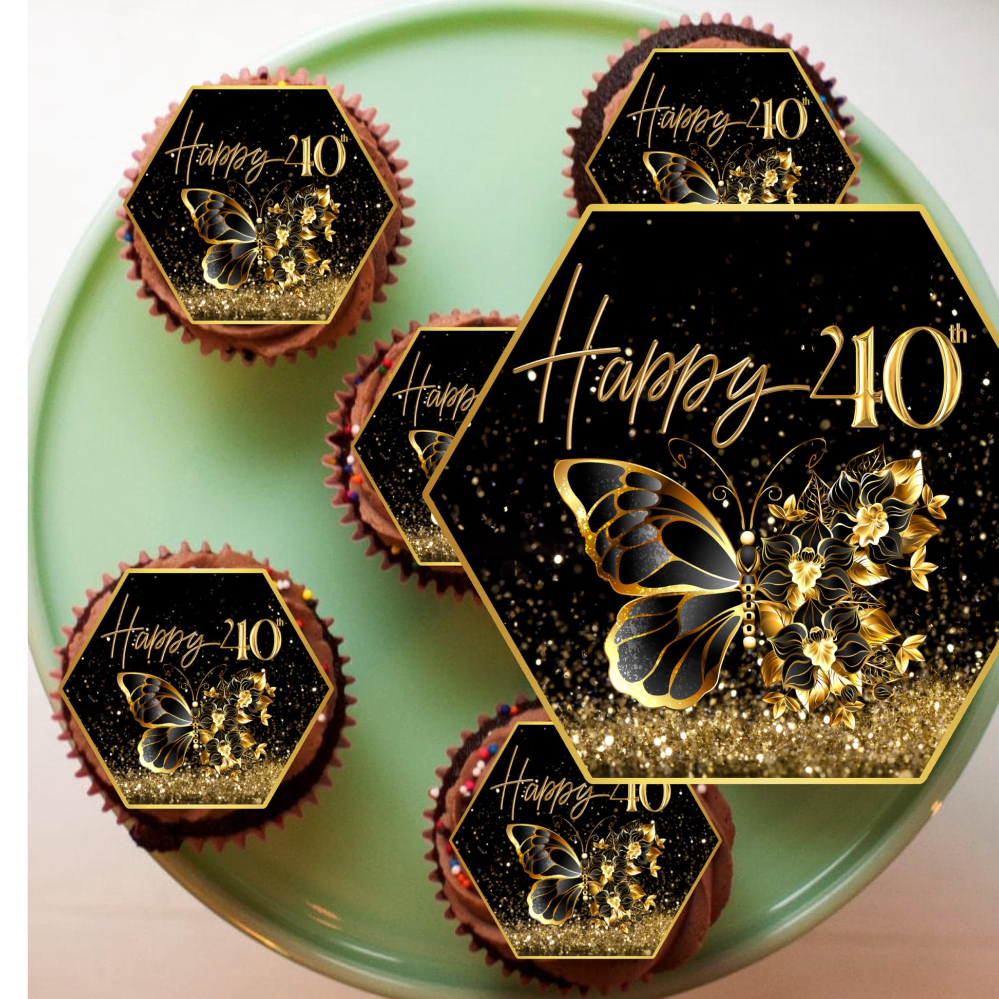 Glamorous black and gold edible cake topper, gold butterfly design icing sheet, 40th birthday, luxury party supplies, 40th birthday edible cupcake toppers.